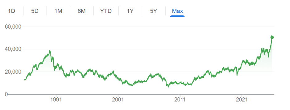 For decades, Japan’s equity market was overshadowed by what became known as the “lost decades.” Beginning in the early 1990s, the collapse of a massive asset bubble triggered sharp declines in property and stock market values. Easy credit and loose monetary policy in the years leading up to the crash had fuelled speculative excess, but when the bubble burst, the fallout was severe. Non-performing loans surged, crippling the banking sector and undermining financial stability. Persistent deflationary pressures kept interest rates anchored at –0.1% for nearly a decade, eroding growth and investor confidence. Ineffective government stimulus measures and mounting demographic challenges from a shrinking population further compounded the stagnation. The result was a prolonged period of economic weakness and deflation that defined Japan’s lost decades.